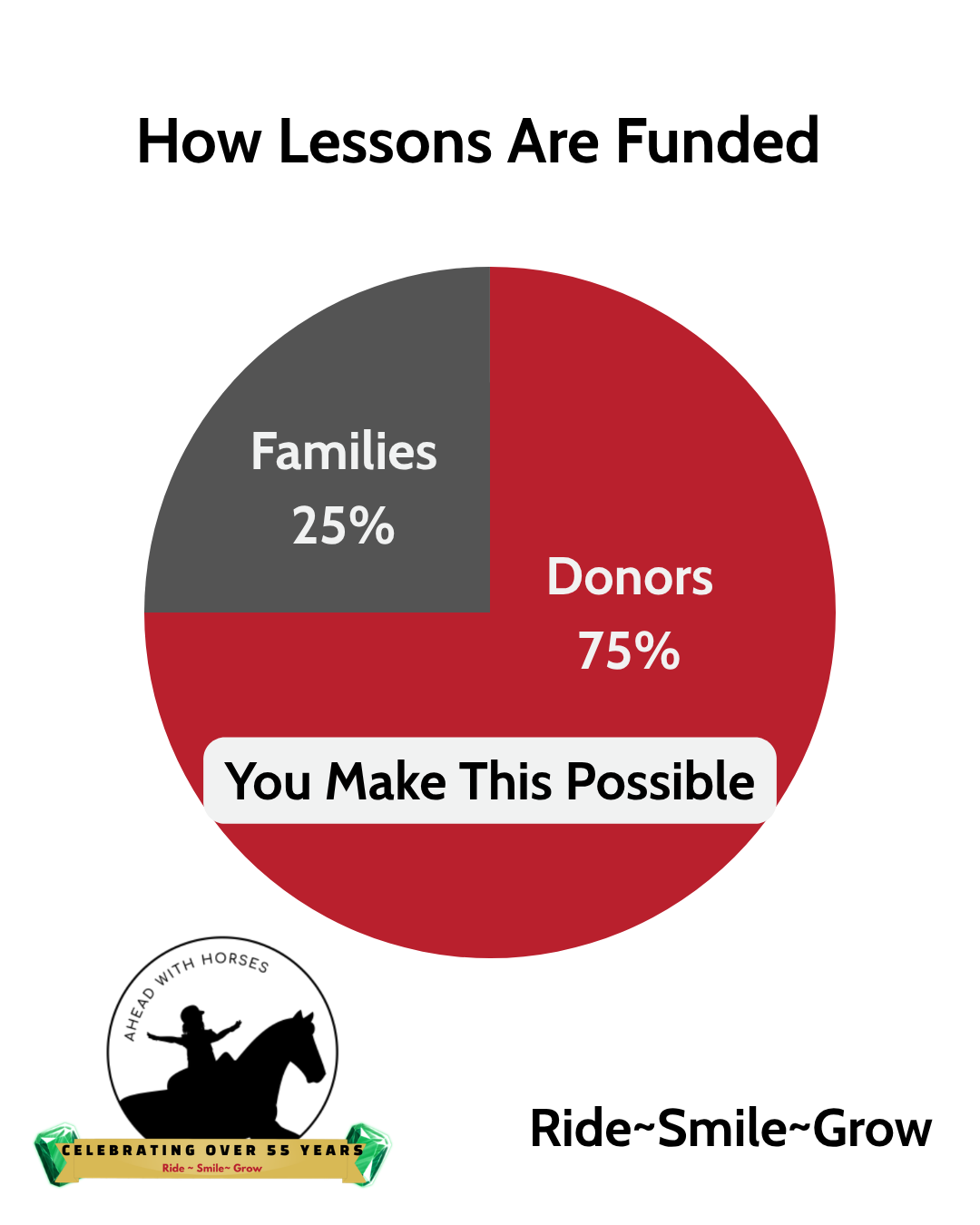 Lesson fees cover just a fraction of what it takes. The rest comes from people who believe every child deserves the chance to Ride, Smile, Grow.
